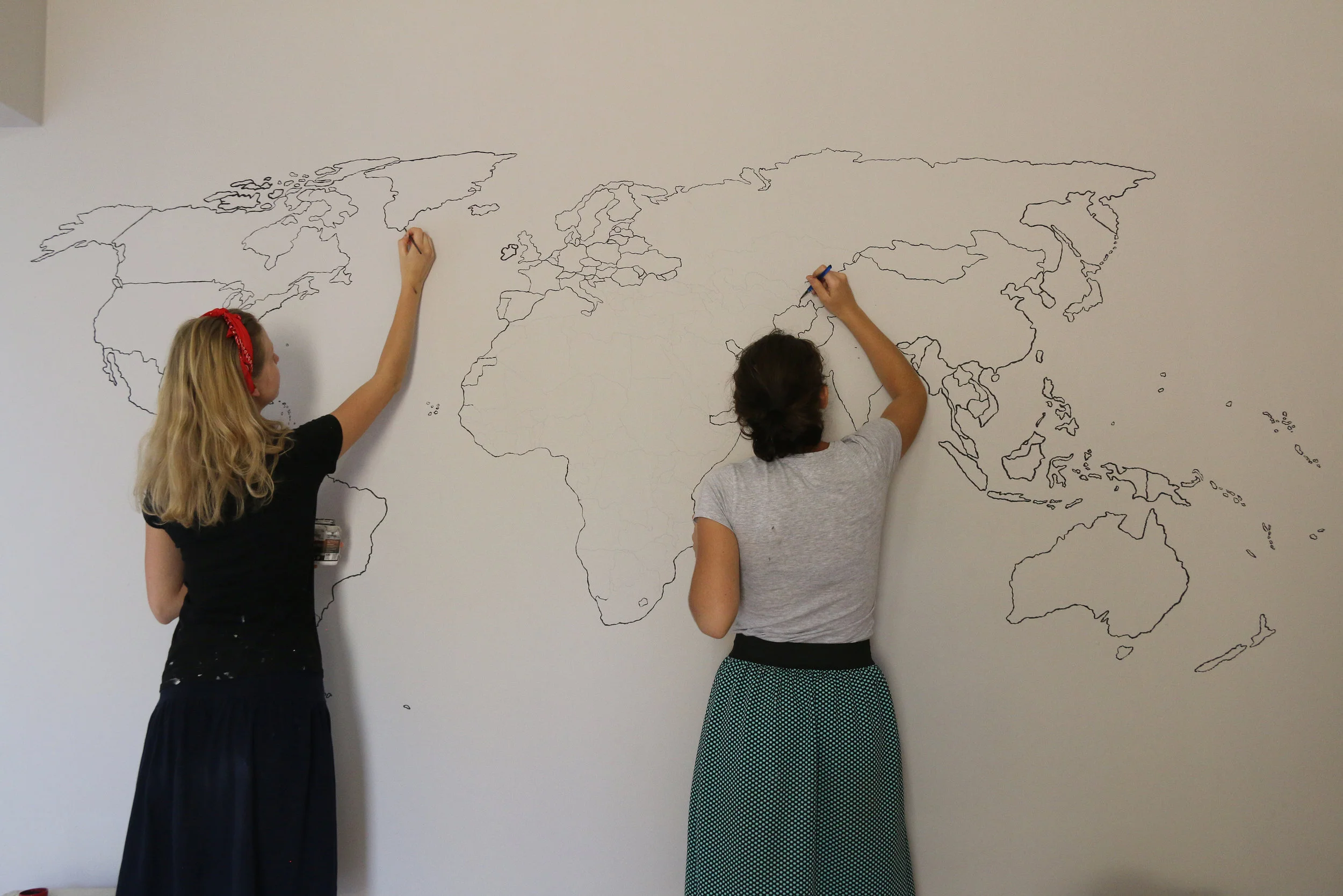 Мы начали красить. Настроение поднялось уже в магазине, при выборе банок с краской, кисточек и валиков! Я была рада от того, что вот-вот начну делать, то что люблю, а Нинель от того что есть хоть какая то работа. После недели "почти-ничегонеделания" мы были очень рада. Первый проект, перекрасить домик для гостей и нарисовать на стене карту мира. Кухня и коридор постепенно превращались из грязно-желтого в светло серый, а потолок из цементного, в нормальный, белый. Ох, я люблю видеть результат какого-то дела, особенно когда ты делаешь это своими руками. На второй день докрасили и принялись рисовать карту мира. Саша принёс проектор, да, я не рисовала ее от руки как спрашивал почти каждый в дом заходящий, но это все равно было не так легко как кажется. Три дня мы почти не выходили из дома. Хотелось закончить карту и поскорее увидеть результат. В середине процесса в дом приходили разные люди. Каждый хвалил, выражал восторг, спрашивал, как мы это сделали, терял пол восторга, когда слышал что с помощью проектора и потом искал свою страну. Дважды приходилось перерисовывать страны, дабы угодить тем, кто там родился. Ничего не знаю, но конечный результат мне очень нравится. Увидев наше с Нинель художество, посыпались заказы. Причём весьма реальные. Джонатан захотел карту Африки в кабинет. Хорошо, будет карта Африки. Ощущение и осознание того, что делаешь, что-то стоящее очень сильно мотивировало и поднимало настроение.